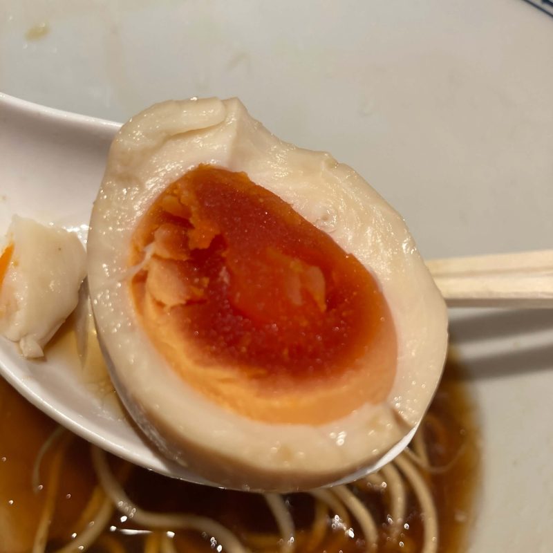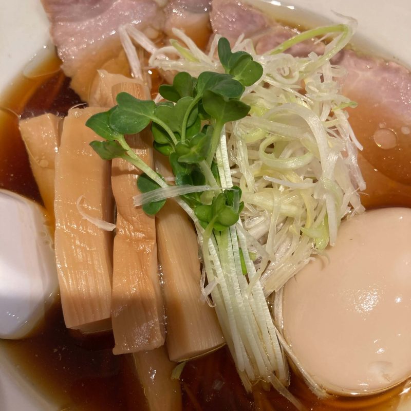 トッピングの味玉、チャーシュー、そしてメンマに刻みネギと