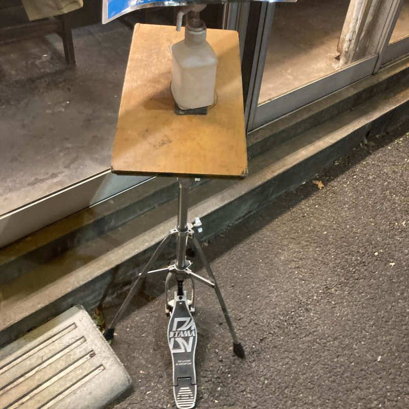 ハイハットの台に乗せられたアルコールでしっかり消毒を済ませ